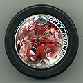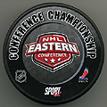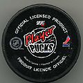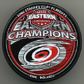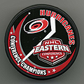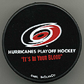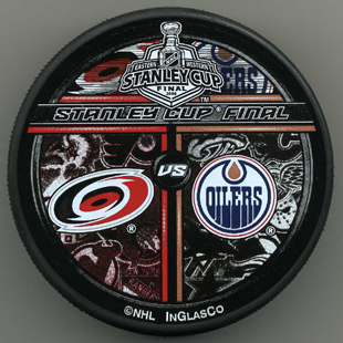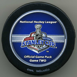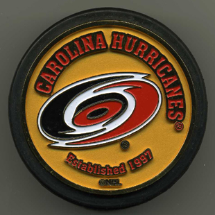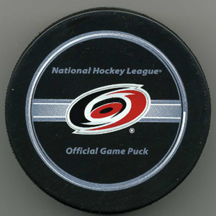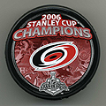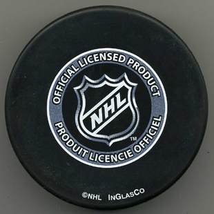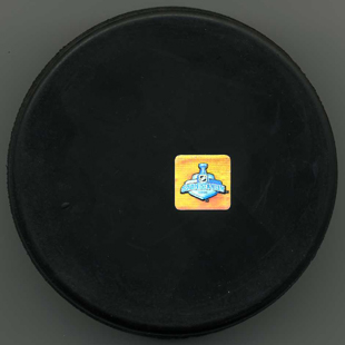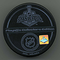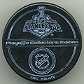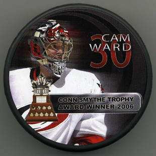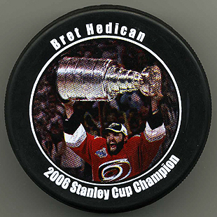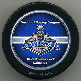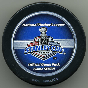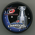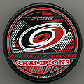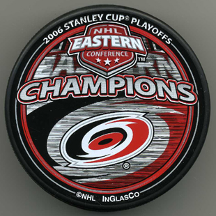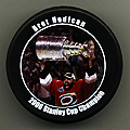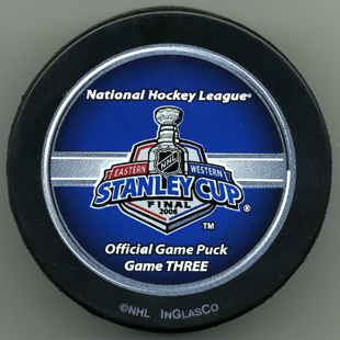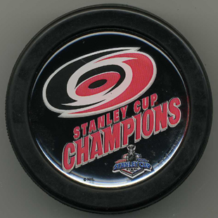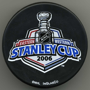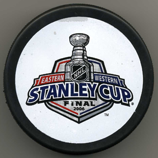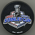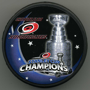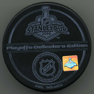 2006 Cup Champions. Same back as the other 2006 playoff pucks but now there's a miniature "NHL Licensed Product" sticker.