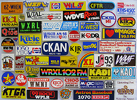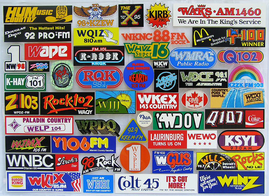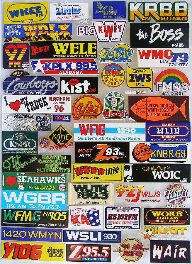 Another "upright" collage. WKEE was in West Virginia and was where Vince Rutherford (13 Big WISE in Asheville) once worked. KRBB is a COOL sticker but I can't remember where it was. The current KRBB is in Knoxville and there used to be a KRBB in Wichita, KS but the frequencies don't match up. WMC was the Memphis TN station where WKSF's Chuck Finley worked for a while. 97IT was the station in Canton, NC. I was friends with a guy named Frank Byrd ("The Byrd-Man") who worked there. The only other thing in Canton was the paper mill (Girl: "Honey, kiss me where it stinks." Guy: "OK, I'll drive you to Canton!"). We have here another version of the KATT logo but not as cool as the original, above. WAIR was the R&B station in Winston-Salem, NC. Seems like it was the AM of WKZL? WFGW/WMIT was the religious station in Black Mountain, NC (about fifteen miles from Asheville). I drove up there one day to see if they had stickers. Walked in, and the lobby looked like I'd walked into a church. Bibles everywhere, and a big framed picture of the J-Man hanging on the wall. The receptionist was an old lady. They had one sticker sitting on the table. I thought I needed to put on a really good act to get it so I told her something along the lines of "Ma'am, may I please show my love for The Lord by having one of your stickers for my car?" KFAT was in Gilroy, CA (the garlic capitol of the world) and was another E. Curtis sticker.