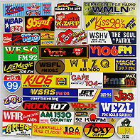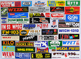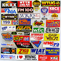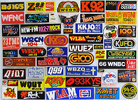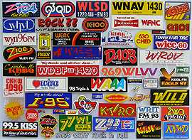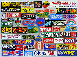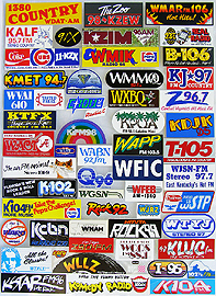 These "collages" of various stickers were done between 1983 and 1988 and feature many from the various markets I worked in, also ones gotten from trading with friends. One friend, E. Curtis Johnson who worked at Q105 Oxnard/Los Angeles, got me most of the West Coast ones (and E. Curtis, if you ever read this, mail me. I've been trying to catch up with you for years!)