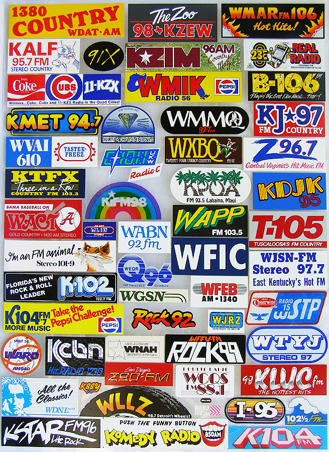 This was my first "small" collage, and, again, was done for the purpose of covering the smaller blank spaces (the only ones that remained) on my bedroom walls. Also, this one shows the only instance of me screwing up and putting the same sticker on two different boards —WMC Memphis. WTYN Tryon, NC was from the hometown of Brother Bill. This one features two "balloon" stickers: Q105 Tampa, FL and KCEE which was in Tucson, AZ. WWNC became the sister station of WKSF after the big sale in 1986 which was Pine Trails Broadcasting buy WKSF/WISE, then sell WISE, then buy WWNC, then move us into THEIR building. This was the beginning my leaving Asheville. Z-100 was actually located in New Jersey but was across the river from New York City and is the station where Scott Shannon devised that awful "Morning Zoo" bullshit. Not long after I moved to Asheville from Wilmington, WAAV obtained the 980 AM frequency, leaving the 1340 frequency open. It became WBMS which stood for "Wilmington's Black Music Station." The stickers were a whole lot better than the radio station. KOOO was, I believe, in Omaha, NE and was one of several stations at the time doing the Al Hamm's "Music Of Your Life" format (which WAAV did while I worked in Wilmington). KRQR was in Chico, CA and was another E. Curtis sticker.
