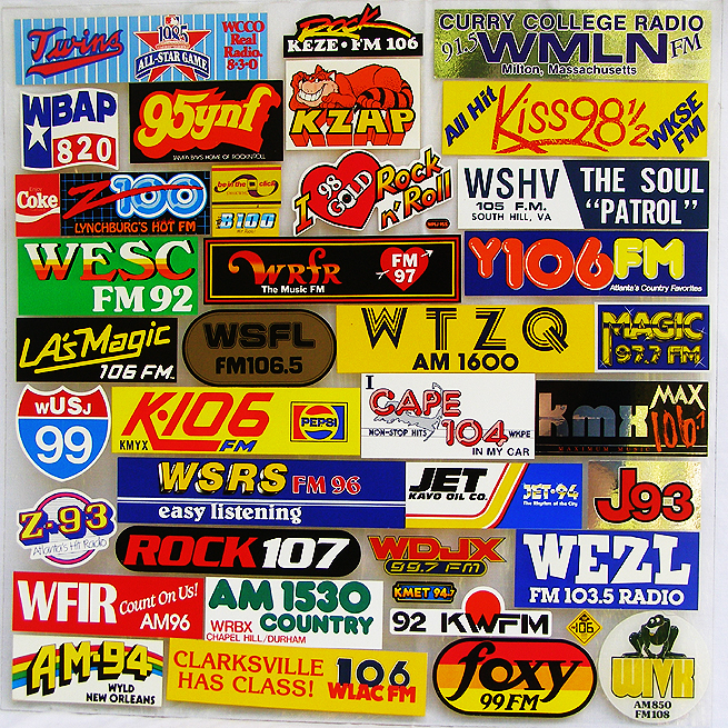 This one features two oldies from when WGNI was the AM station and WAAV was the FM. By the time I was there in 1983 they'd swapped the calls. WACO in Waco, TX is, I believe, the only instance of call letters actually spelling out the name of the city where the station is licensed in the entire USA. WPET was Tom Armshaw's AM station, his FM station WRQK was where Steve Finnegan worked in Greensboro, NC. This was the most cheaply done sticker I'd ever seen, and looked like they had hand-painted them using stencils. WJET was the station that the Fin Man grew up listening to in Erie, PA. I was writing The Cat's Pajamas radio humor sheet at the time and I'd made friends with another writer named Judy in Philadelphia who sent me the WYSP sticker. Also the one from WZZD which was funny because everytime we saw it we thought it said "Jesus Lives in Philadelphia." Whenever this came up in a conversation somebody always said "Yeah and he was born in Bethlehem... a steel town."