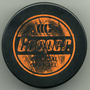 This one was made by Cooper, manufacturer of hockey equipment in the 1970s. It may be a fake; I bought it from some guy on Ebay and the Rebels logo looks like it was from a cut-out bumper sticker put onto the puck.