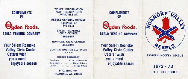 The Roanoke Valley Rebels began playing as the Salem Rebels at the Salem Roanoke Valley Civic Center shortly after it opened in 1967. When the Roanoke Civic Center opened in 1971, they became the Roanoke Valley Rebels and played some of their games there. After the 1975-1976 season the team moved to Tallahassee and became the Tiger Sharks. Hockey continued in the SRVCC with the Salem Raiders, but to those of us who had cut our hockey teeth on the Rebels, it just wasn't quite the same.