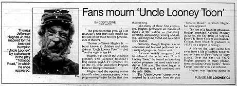 During his years at WSLS Radio and TV, Tom worked with Mel Linkous, Dick Burton, Lee Garrett and with program director George Chernault, whom he'd befriended while in the Army. Chernault was responsible for buying the Looney Toons cartoon package for use by Channel 10, and is believed to have been the one who thought of featuring them during a daily show hosted by a character named Uncle Looney. But from that point on, Uncle Looney brought to life by Tom.
