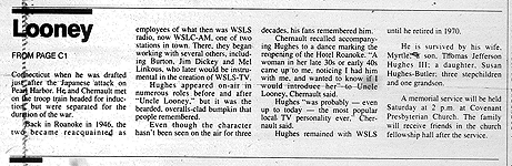 Tom Hughes was the Channel 10 personality whose talent as an actor brought Uncle Looney to life from 1956 through 1965. Tom was one of the television pioneers who launched WSLS-TV 10, and was the very first "official" voice ever heard on Roanoke television. After getting off to a disastrous attempt to put the station on the air the day before, Tom read the opening station identification announcement when programming began for the first time (and everything actually worked) on December 11, 1952. Tom performed all sorts of duties at the station over the years, including producing, directing, announcing, writing and acting. But primarily he was an actor who was featured on many programs including "Tom's Foolery" in the early 1950s, then the Uncle Looney show.