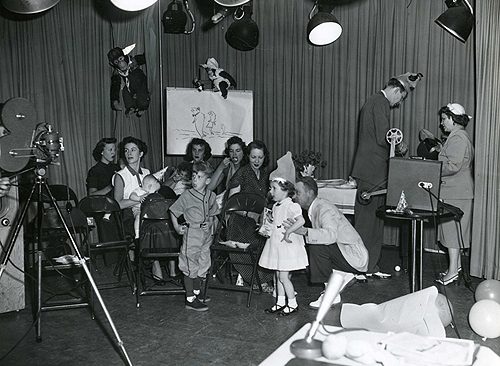 This is a shot of the "Tom's Foolery" studio audience, as seen from the desk where Tom and Dick sat for the show. The show was produced in the original Channel 10 studios on the top floor of the Shenendoah Life building (the original one downtown, not the one that was later built on Brambleton Avenue). Tom, kneeling, is talking to his wife. Dick is in the back corner (that may be his wife as well). According to Jeff Hughes, prior to the airing of each show, cartoons were shown on a screen from that small projector so the kids would sit still while waiting for the show to begin. Jeff said that the monkeys hanging from the ceiling used to scare him when he was a little kid. This was a Friday, when it was "Birthday" time and local kids with birthdays that week were honored on the show.