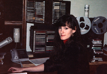| Ellen Flaherty, voted "Best Area DJ" in a 1989 Roanoke Times / World News reader's poll, in the original FM studio at 15th & Cleveland. |