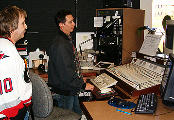 | Steve Cannon shows the WGMN studio to Pat Garrett. |
